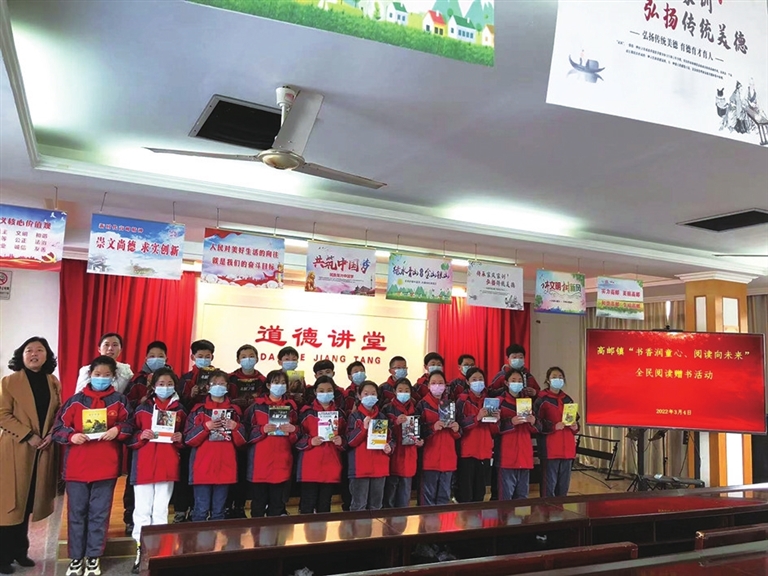 近日,高邮镇开展“书香润童心,阅读向未来”全民阅读赠书活动。镇文体活动中心的老师们精心挑选一批青少年读物,向城北小学等5所学校、月塘社区等3家“城市书房”捐赠书籍300多本,受到学生和社区群众的欢迎。图为赠书活动现场。