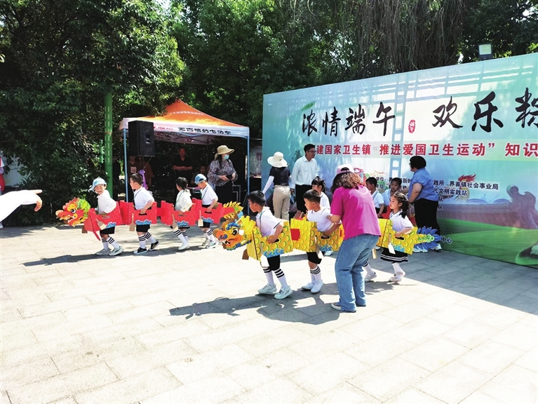 来自中心幼儿园的3支“旱地龙舟队”在赛道上比拼,稚气可爱、妙趣横生。界首卫生院药剂科医师给观众现场制作并赠送驱蚊香囊,普及卫生常识和创建国家卫生镇知识,拓展了活动内涵。