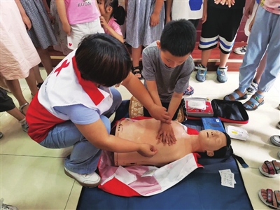 21日,市红十字会联合南海社区博爱家园开展了以“生命教育 人道伴行”为主题的应急救护知识培训活动,为暑期公益托管班的学生们讲解急救知识,提高学生们应对突发事件的自救互救能力和安全防范意识。图为活动现场。