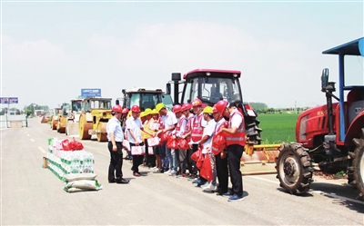 近日,江苏瑞沃建设集团有限公司工会组织工作人员,来到高邮捍海大桥等项目建设现场,开展“酷暑送清凉”慰问一线建设工人活动,为坚守在一线岗位的干部职工送去矿泉水、藿香正气合剂、绿豆、八宝粥、毛巾、洗发露等防暑降温用品和浓浓关爱。图为慰问活动现场。