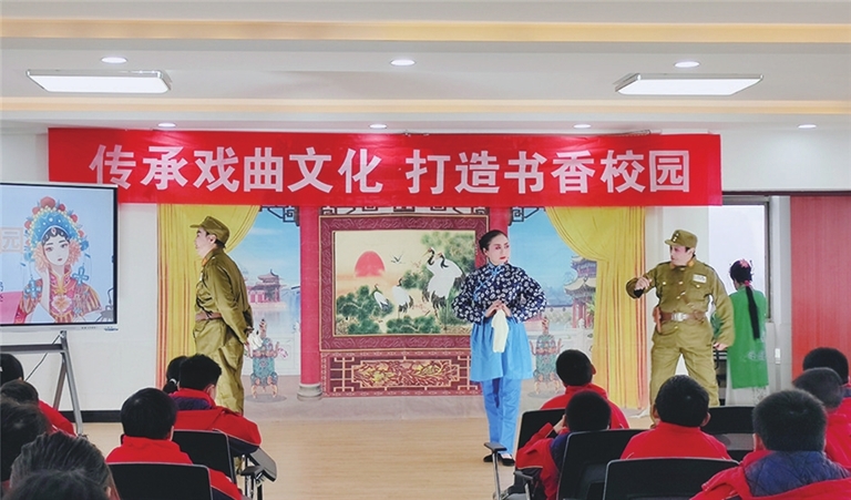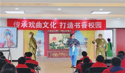 22日,周山镇小学、市文广旅局联合开展了以“传承戏曲文化,打造书香校园”为主题的国粹经典进校园活动。活动中,戏曲老师为孩子们科普了戏曲基本知识,演唱了经典戏曲选段,并现场教授学生经典戏曲动作,让孩子们近距离感受到了戏曲文化的独特魅力。图为活动现场。