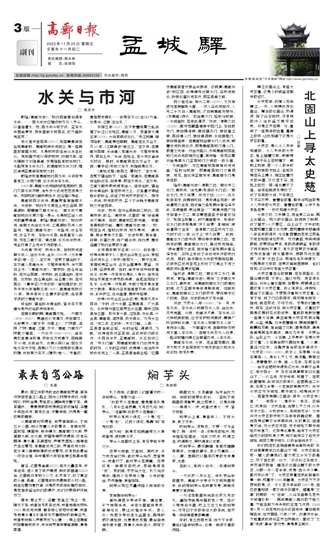 水关通“市河”,市河今存。旧城市河自南水关入,出北水关,全长1680米。《太平寰宇记》卷一三〇,玉女井,“在郭下望仙桥下,东齐道人郏道光与一女居井旁炼丹,与女同日上升。”《高邮州志》,“南市桥,古名迎仙桥,在州治西南。中市桥,古名望仙桥,在州西。北市桥,古名通仙桥,俗名高公桥,在州西北。”《寰宇记》为宋初的一部地理总志,成书于宋太宗雍熙三年(986),距高邮筑城仅15年。其中有关乡土情资的记载,当来源于彼时之高邮方志。