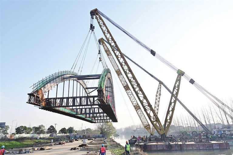 15日上午,随着试吊、起吊、转体、浮吊平移等工序的完成,长度82.64米、宽度13米、重达445吨的系杆拱平稳地落在桥墩上,标志着通扬线高邮段航道整治乡镇段桥梁工程一沟大桥系杆拱整体吊装顺利完成。