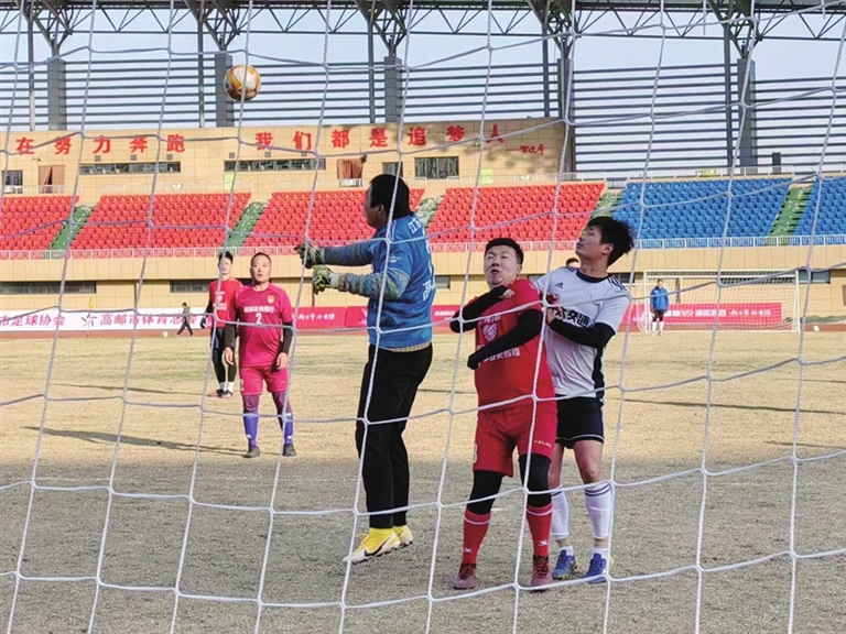 17日下午,由市体育总会和市足球协会联合主办,市邮城足球俱乐部和市文体中心联合承办的2023年江苏省足球运动协会冠军联赛高邮赛区预选赛暨2022年高邮市第四届足球联赛在市文体中心足球场开赛。据了解,此次共8支球队参赛,获得冠军的球队将代表高邮赛区参加2023年省足协冠军联赛。图为比赛现场。 王林山 摄