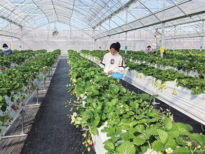草莓园于2022年7月建设,共投资700万元,标准化连栋大棚总面积为13500平方米。不同于一般的草莓园,这里的草莓都是长在“空中”,游客不用弯腰便能进行采摘。