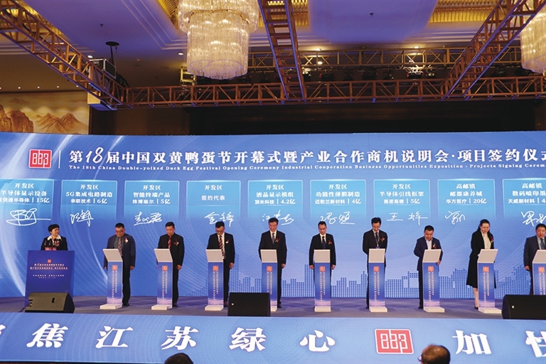 17日上午,在我市举办的第十八届中国双黄鸭蛋节开幕式暨产业合作商机说明会和项目签约仪式上,开发区共有6个项目参加集中签约,分别为计划总投资15亿元的第三代半导体新型显示产品研发制造项目,计划总投资6亿元的5G集成电路制造项目,计划总投资5亿元的智能终端产品、通讯设备和5G智能主板项目,计划总投资6000万美元的液晶显示模组及电脑显示一体机项目,计划总投资4亿元的功能性聚乙烯薄膜制造项目和计划总投资3.5亿元的半导体引线框架项目。此前,在“上市公司高邮行”恳谈会上,开发区还签约了计划总投资20亿元的20GWN型太阳能超薄单晶硅片项目。