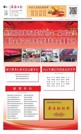 热烈祝贺高邮市酒类行业协会二届五次会员暨协会成立10周年总结表彰大会隆重召开
