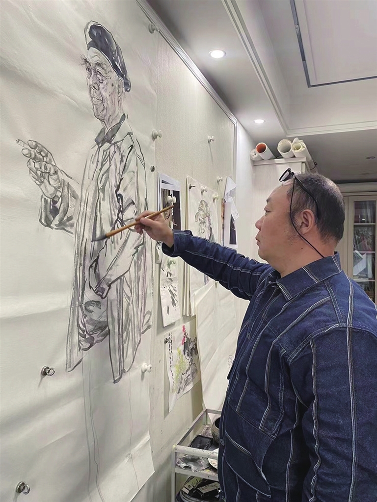 14日上午,记者来到秦磊的画室。柔和而温暖的阳光,透过明净的落地窗户,洒落在画室内。秦磊正聚精会神地在宣纸上练字,身后的墙上挂着他近期的画作——一幅1.8米高的汪曾祺水墨人物画,格外引人注目。画中的汪曾祺一手夹着快燃尽的香烟,一手插在衣兜里,悠然恣意,凝视着远方。栩栩如生、惟妙惟肖的汪老晚年形象跃然纸上!