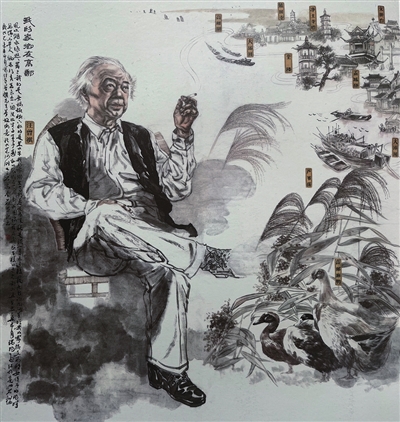 作为土生土长的高邮人,秦磊说,他是读着汪老的作品长大的,汪曾祺不仅是高邮的文化名片,也是他非常敬爱的作家。他接触的汪老第一部作品便是《晚饭花》,阅读后就被汪老灵动、有着烟火味的文字所吸引。他还曾在高邮百花书场见过汪曾祺讲学,这一情景至今让他记忆犹新。“以前很多人穿中山装,汪老当时外面套了件米灰色的风衣,在那个年代是非常时髦的,在人群中特别显眼,这个画面始终萦绕在我脑海中。”秦磊说,此次画作中的汪老就是身穿米灰色风衣。