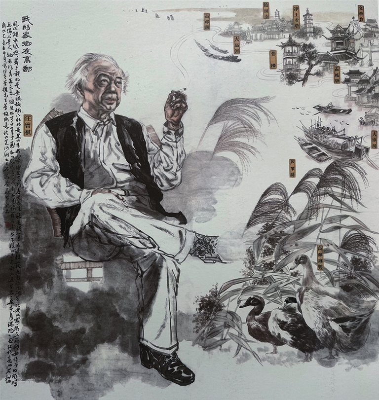 “汪老是我唯一一个画了五次的人物,每一次画,感受都不同。”秦磊回忆道,他第一次画是在1996年年底,画了一幅四尺三开汪老的肖像,由于初出茅庐,作品表现力一般,但却是自己用心创作。1998年中秋,白描汪老全身像,由我市知名学者朱延庆题款,属于非常特殊的一次创作。让他印象最深刻的是2008年画的汪老坐姿肖像。“画前,我做了很多准备工作,观察汪老的照片,阅读他的作品,看汪老朋友们回忆他的文章,去了解汪老是怎样的人。”秦磊说,从汪老面部表情到手部特写,从藤椅磨损细节到火柴的摆放等都是经过不断地推敲才确定的,最终作品效果也颇为满意,被选入《2008江苏高邮市美术书法摄影作品集》,在南京美术馆老馆展出后,获得一致好评。2015年,秦磊在第三稿的基础上又创作了《梦故乡》,作品参加扬州城建2500年重大历史题材展。