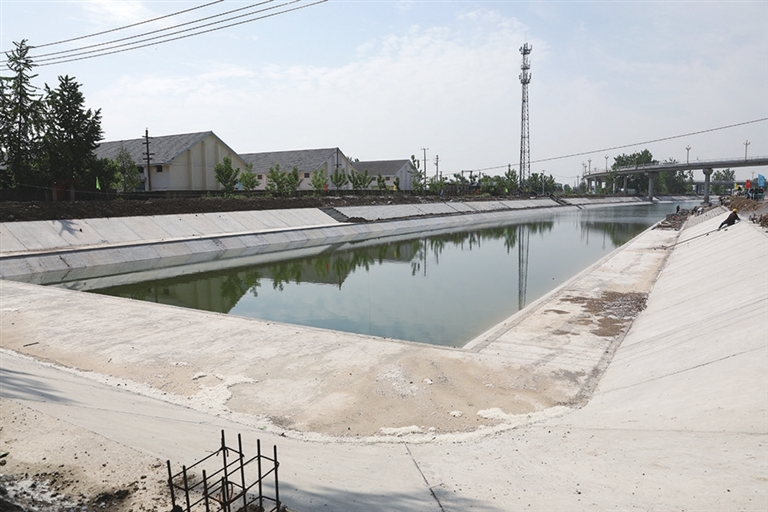 “界首分干渠主要承担界首镇1.04万亩农田灌溉任务。该渠道原为土质渠道,断面较宽,渗漏严重,加之输水线路长,灌溉效率一直比较低。改造后的干渠采用下梯形上矩形断面和连锁块护坡防护,岸边砌筑砼空心砖直立墙,两侧设置缓坡平台,工程完成后可极大提升渠道的输水速度和农田灌溉效率。”吴春海介绍,界首分干渠硬质化改造工程属于二标段建设内容,共衬砌渠道2.638千米,新建退水闸1座、分水口9座、巡查道路2.638千米、防撞护栏2.638千米等。