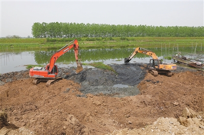 施工方江苏润邮水利建设集团有限公司项目负责人杨朝湖介绍,送桥和菱塘属于丘陵地带,遇到连续暴雨天气,排涝十分困难,所以此次工程在天菱河沿线新建、改建7个泵站,将大大提升区域防洪、排涝能力。为赶在5月底汛期前完成整个大堤水下工程部分,他们采取了分段施工的办法,在天菱河东岸摆开了“一字长蛇阵”,每天都有60多台套施工机械和300多工人加班加点施工。