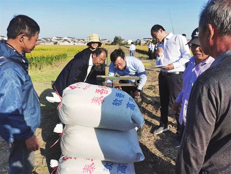 本报讯(通讯员 思桂 记者 文正)10月29日,省农业农村厅组织专家组对我市临泽镇水稻绿色高质高效创建泰香粳1402百亩示范方开展“超级稻”实割测产验收。经测产,最高田块单产达828.3公斤,创扬州地区水稻高产纪录。
