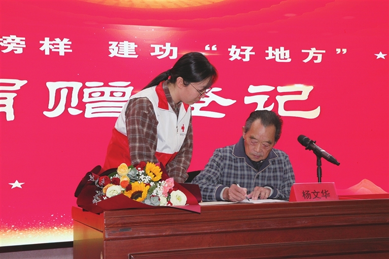 宣讲结束后还举行了自愿遗体捐献申请表签署仪式,杨文华现场向市红十字会志愿者递交了《志愿捐献遗体申请登记表》,市红十字会向其颁发了《志愿遗体捐献登记证书》。