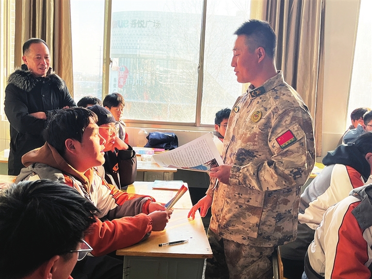 2024年春季征兵工作已全面启动。日前, 沿河社区邀请高邮镇人武部相关负责人到高邮中等职业学校开展热血青春从“军”开始——参军入伍政策宣传活动,全方位、多角度向青年学子宣传应征入伍优惠政策、参军条件、退役后入学流程等,营造浓厚征兵宣传氛围。图为活动现场。