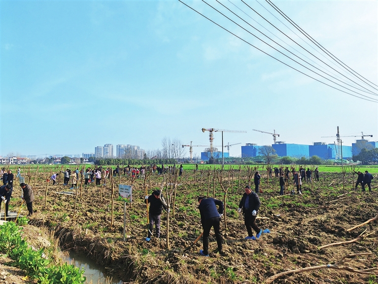 11日上午,城南新区组织区党政班子成员、市驻区镇部门单位负责人、扬州职大校方代表、机关工作人员、各村(社区)负责人、志愿者等,前往城南新区学苑社区开展义务植树活动,共栽植紫薇苗木600株,为生态高邮建设增添新绿。图为活动现场。