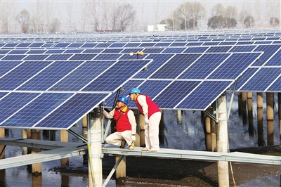 日前,市供电公司组织党员服务队队员前往甘垛镇官林村北侧的500亩荡区光伏发电站,义务检查和维护太阳能板等设备,确保发电站可靠发电。图为检查现场。