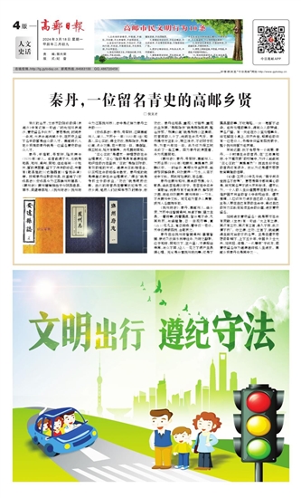 如何追求青史留名?就是要对社会有贡献。《左传》有一句话:“太上有立德、其次有立功,其次有立言,虽久不废,此之谓不朽”。你立德、立功、立言了,就能赢得生前死后的不朽名声。正是在儒家思想的影响下,上下五千年,中国多少士大夫,如包拯、海瑞、“一代廉吏”于成龙,把青史留名作为道德信仰和人生追求。高邮乡贤秦丹也是其中之一。