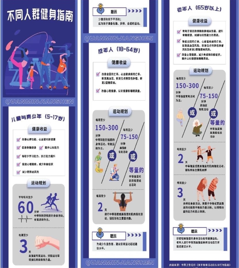 为发挥运动的健康功效,世界卫生组织为各年龄段人群制定了运动建议。