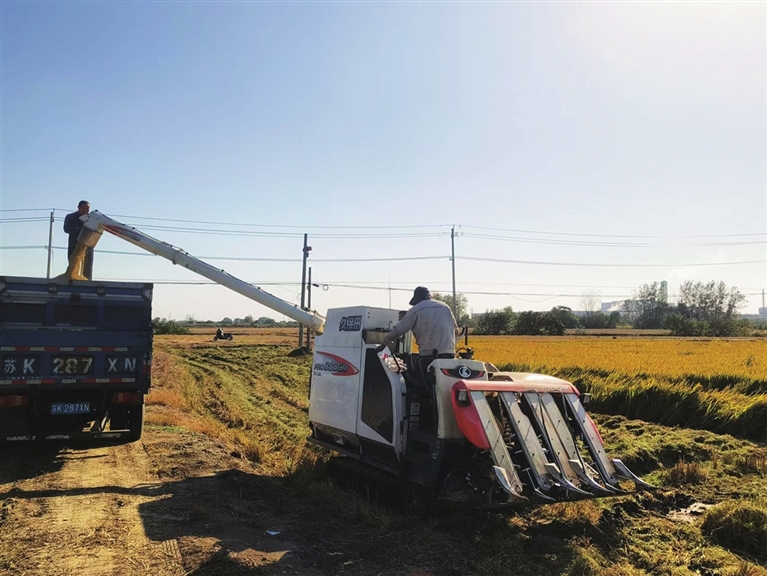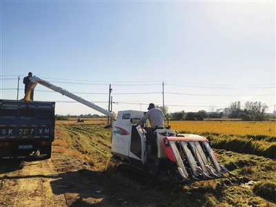 当前,我市82.55万亩水稻进入收获期,收割进度近六成。稻田里,收割机来回穿梭,农户们抢抓晴好天气,收割、脱粒、装袋,确保秋粮颗粒归仓。图为龙虬镇水稻收割场景。