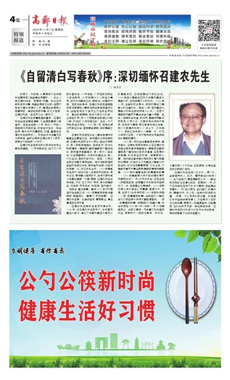 1984年3月我始任高邮县委常委、宣传部长,经常听老同志向我介绍召建农先生担任县委宣传部副部长、高邮报社副总编和县广播站站长的点点滴滴,召老是我的前辈,我见到他总怀有一种崇敬的心情。在我担任宣传部长和政府分管文教副市长期间,参加过几次书画函大高邮分校的活动,我对召老勤勤恳恳、不计名利,为高邮书画艺术事业默默奉献的精神深感敬佩。2006年我编著出版《故事里的故事——1931年高邮特大洪灾和运堤修复历史再现纪实》一书,该书发行后,召老正在人民医院住院,他特着孩子去新华书店购买了一本,在病榻上反复阅读。1931年那场特大洪灾使他心灵震撼,感慨万千,于是,他写了《我所亲历的1931年悲惨洪祸——读<故事里的故事>后的回忆》《解放后几次抗击特大洪涝灾害取得胜利——读<故事里的故事>的再回忆》两篇文章,先后发表在2007年8月9日和11月26日高邮报上。他的文章进一步丰富了我作品的内容,使其抗灾人性的光辉进一步升华。文章发表4个多月后,召老病逝,这是他留给我们的临终绝作。