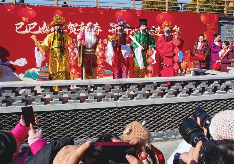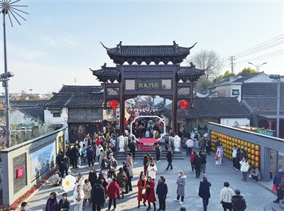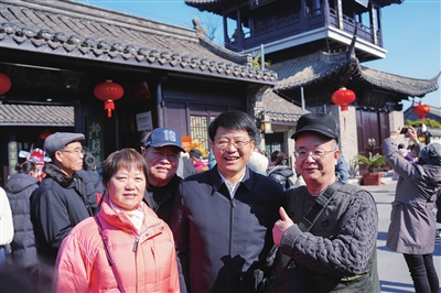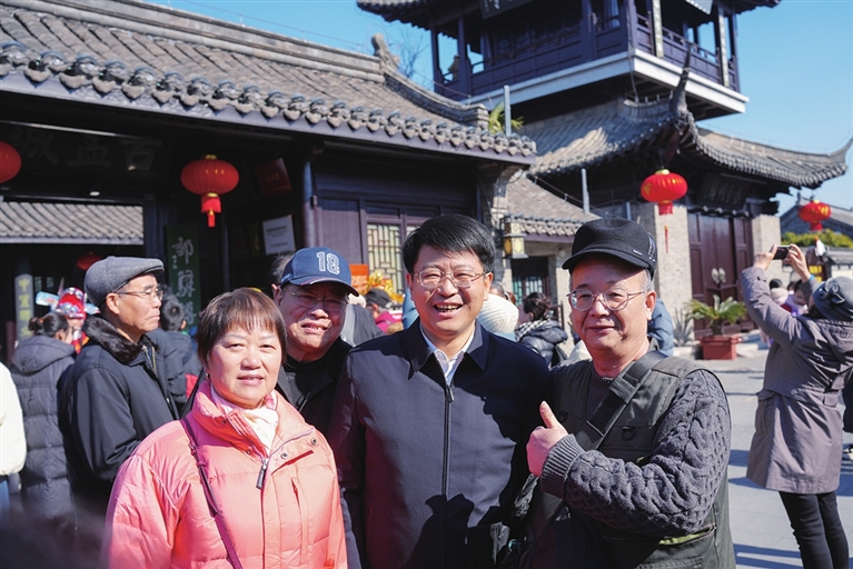 大年初一上午九点,高邮运河·盂城驿街区内已是游人如织、摩肩接踵,市民和游客们拖家携口,赶赴一场新春的大集。“祝大家新春快乐, 阖家幸福,欢迎你们来高邮过年!”当天上午,市委书记田醒民来到运河·盂城驿街区,向游客送上新春祝福,询问他们在邮旅游的感受,并现场向外地游客推介高邮文旅。“高邮服务好!”“高邮城美!”“高邮人好!”来自上海高朋国际旅行社150人的“过年团”游客们一拥而上, 争着为这次的行程点赞。上海游客顾鸿福与爱人一同报名了“过年团”。“时隔多年再来高邮,这里变得更美,可玩的地方更多了。”顾鸿福告诉记者,此次高邮行,他们看民俗、赏好景、品美食,对高邮留下了深刻的印象。