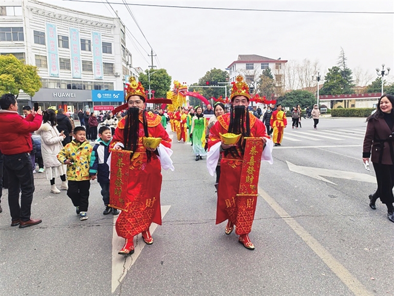 队伍中,两位身着红袍、头戴金冠的“财神爷”格外引人注目,他们手持金元宝,向道路两旁的市民拱手作揖,送去新春的祝福。沿途市民纷纷驻足观看,并举起手机拍照留念。