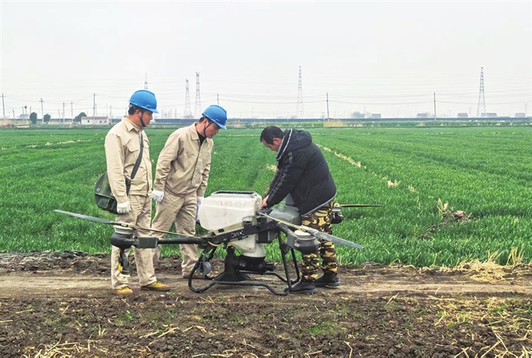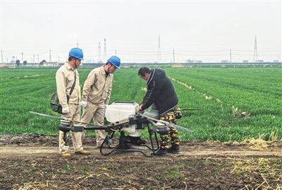 正值春耕,市供电公司组织人员走进田头,提醒无人植保机操作手在无人机施肥飞行前设置“飞行限高”避让电力线路,做到农田护理、电力设施保护两不误。图为三垛供电所员工向无人植保机操作手宣传电力设施保护知识。