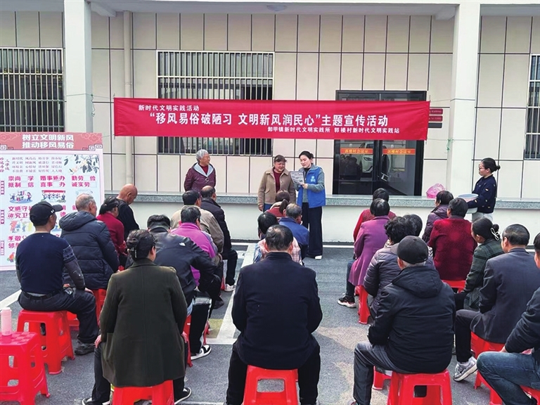 近日,卸甲镇新时代文明实践所联合郭楼村举办“移风易俗破陋习 文明新风润民心”主题宣传活动。现场,志愿者用群众语言宣讲移风易俗的重要意义,积极倡导“婚事新办、丧事简办、厚养薄葬”的文明理念。图为活动现场。
